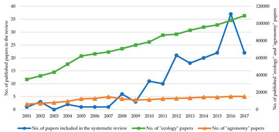 The first recorded paper studying the influence of sustainable agricultural practices on ecosystem services was published in the year 2001. The number of scientific publications addressing this topic modestly increased from 2007 (n = 1) to 2017 (n = 22), with the highest peak in 2016 (n = 37). These results show that this topic is an exponentially growing research field, but there are still few studies that have focused on it to date. This fact becomes more evident when we compare the published papers included in this review to the total number of publications on ecology and agronomy. The number of papers including the keyword “ecology” arithmetically grew from 35,037 in 2001 to 109,071 in 2017, while the ones including the keyword “agronomy” have also undergone arithmetic growth but remained very stable from approximately 2005 (n = 12,471) to date (n = 15,196) (Figure 2).