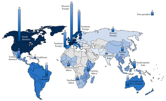 Geographical distribution of the study areas of the published papers included in the review. For each geographical area, the number of published papers is specified in columns. The non-specified column represents theoretical studies.