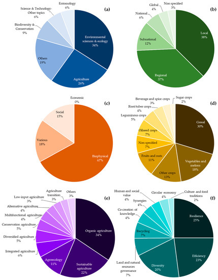 Percentage of reviewed papers characterized according to the (a) research areas specified in Web of Science, (b) spatial scale of analysis, (c) methodological approach, (d) studied crops, (e) terms used to refer to the type of agricultural management and (f) the FAO’s elements of agroecology considered.