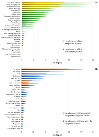 Number of papers that mention and empirically analyze (a) agricultural practices (green and yellow columns, respectively) and (b) ecosystem services (blue and orange columns, respectively). Both categories were named as they appeared in the reviewed papers. The practices named no/natural fertilizers, pesticides and herbicides refer to the nonuse of these inputs or the replacement of chemical inputs by natural or organic ones.