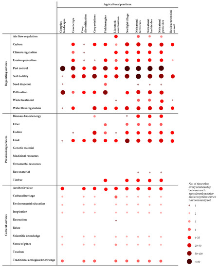 Number of relationships recorded between each ecosystem service and the most frequently analyzed agricultural practices.