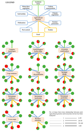 Significant relationships between the agricultural practices and ecosystem services most frequently studied. Line width represents the number of observations between each practice and ecosystem service. Pie charts represent the percentage of positive (green) and negative (red) observations for each relationship. Regulating services are represented in blue, provisioning services in yellow and cultural services in green.