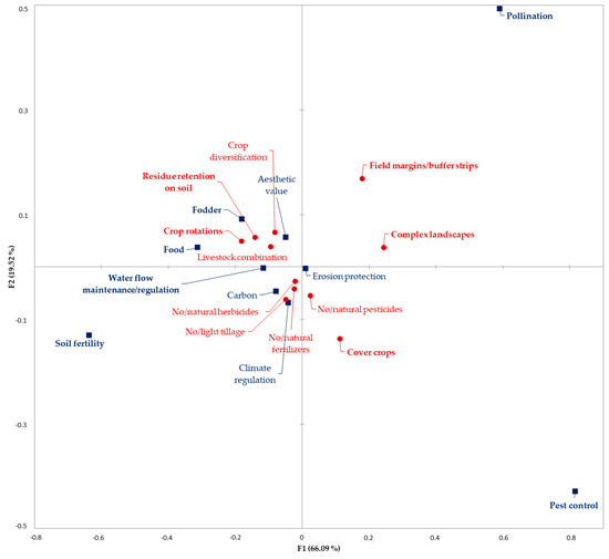 Biplots resulting from the redundancy analysis (RDA) performed to uncover the relationships between sustainable agricultural practices (red) and ecosystem services (blue). Bold text represents the agricultural practices and ecosystem services with higher scores.