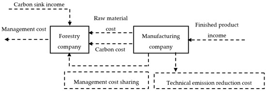 The cash flow of the wood forest product supply chain under the SCS is shown in Figure 2. It is obvious that the forestry company has one cash outflow (cost): the cost of managing forests (including timber forests and carbon sink forests), and four cash inflows (income): carbon sink income from the emission right market and the manufacturer, respectively. The timber income and the management cost are shared by the manufacturer. Meanwhile, the manufacturer has four cash outflows (costs): raw material cost, carbon cost, technical emission reduction cost, and part of the forestry company’s management cost. One cash inflow is involved, the finished product income.