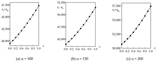 Figure 4 shows the relationship between the carbon sink cost-sharing coefficient and the profit of the supply chain when the low-carbon demand sensitivity coefficient , respectively. Figure 4 indicates that the profit of the supply chain under the non-sharing mechanism () is less than the profit under the SCS mechanism, and the overall profit of the supply chain is positively correlated with the sharing coefficient. That is, under the SCS mechanism, the members of the supply chain can obtain higher profits through the cooperation mechanism.