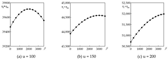 Figure 5 shows the relationship between the emission reduction cost-sharing coefficient and the profit of the supply chain when the low-carbon demand sensitivity coefficient , respectively. It’s easy to find that, as the emission reduction cost-sharing coefficient increases, the profit of the supply chain first increases, then decreases gradually. It can be concluded that under the ERCS mechanism, there is an optimal sharing coefficient such that the profit of the whole supply chain reaches a maximum, and the profit is greater than the maximum profit under the non-cooperative mechanism (). It is obvious that the whole supply chain can achieve higher profit because of the ERCS mechanism.