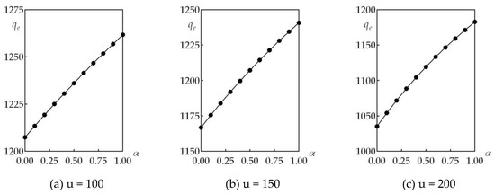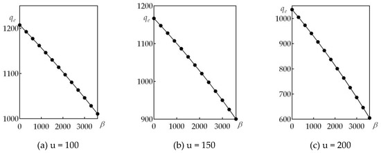 Figure 6 and Figure 7 show the relationship between the manufacturer’s carbon emissions and cost-sharing coefficients. It is obvious that under the ERCS mechanism, the carbon emission level of the manufacturer is negatively correlated with the sharing coefficient, . While under the SCS mechanism, it is positively correlated with the sharing coefficient, .