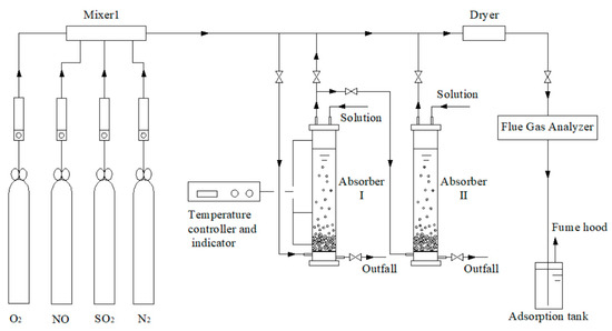 | 10 | Tandem double column absorption experiments | Q = 2 L/min, [NO] = 500 ppm, [SO2] = 1000 ppm, O2 = 10%; Tabsorption = 50 °C, [Na2S2O8] = 0.5 wt.%, [NaClO2] = 0.2 wt.%, pH = 12 (the first absorber); Tabsorption = 25 °C, [reagent] = 5 wt.% (the second absorber) |