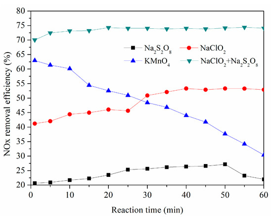 - A preliminary reaction mechanism for the simultaneous removal of NOx and SO2 was deduced, based on experimental results. The dual oxidant (NaClO2/Na2S2O8) solution can effectively remove multi-pollutants and, thus, it has the potential to be applied in the wet desulfurization and denitration process to realize the synergistic removal of multi-pollutants.