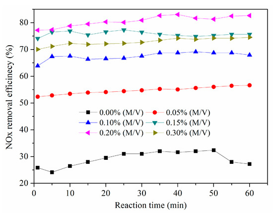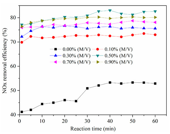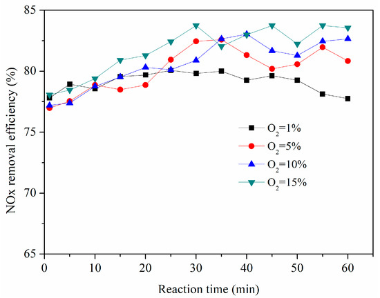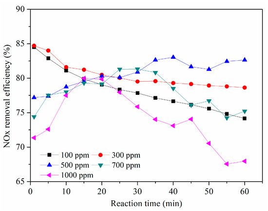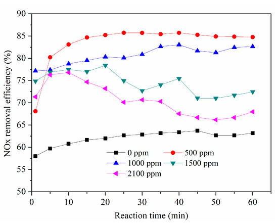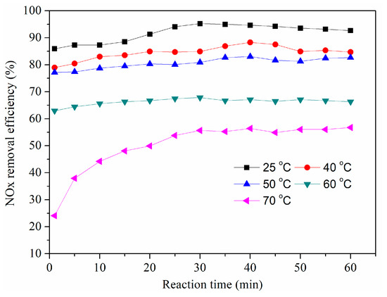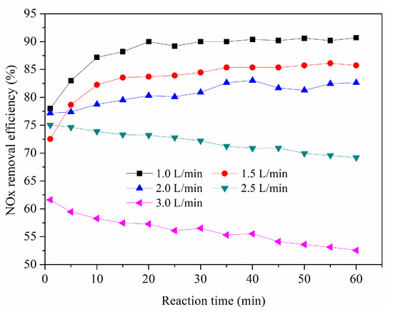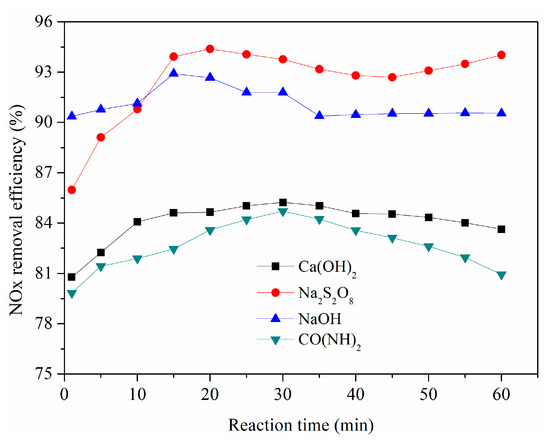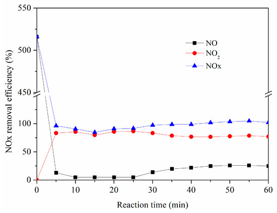 - Considering the NOx removal efficiency and its economic costs, the optimal conditions for NOx removal were determined to be when the solution temperature was 50 °C, the initial solution pH was 12, the gas flow rate was 2 L·min−1, and NaClO2 and Na2S2O8 concentrations were 0.2 wt.% and 0.5 wt.%, respectively. A NOx removal efficiency of more than 80% could be obtained at optimal conditions. When using a NaOH solution as an absorbent in the second absorber, the NOx removal efficiency could reach more than 90%.