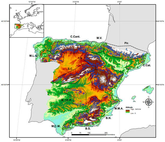 Mountains occupy slightly less than half of Spain’s total area. Most mountains are within the Mediterranean bioregion. European mountain and Mediterranean ecosystems are more vulnerable to global change than other European ecosystems [] (increased risk of forest fires, erosion, and water availability, for example) causing the Mediterranean mountains, which are the main type in Spain, to suffer a loss of agricultural and forestry services. Some statistical models already have forecasted a migration of Mediterranean tree species to higher elevations and a related decline in temperate or cold-adapted tree populations during the 21st century []. Ruiz–Labourdette et al. [] reported in their study how large areas in the world covered by cold-wet Euro–Siberian conifer and broad-leaved forest communities would be lost due to global warming. They also remarked how the major changes will occur for the Mediterranean species of conifers which are presently found at low mountain elevations.