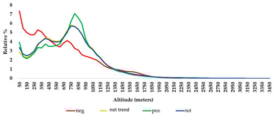 Relative percentage of pixels (Y-axis) with a significant NDVI trend along altitude in meters (X-axis) in the whole of mainland Spain. It must be noted that the percentage shown on the Y-axis refers to the total number of pixels belonging to all mainland Spain with a negative NDVI trend (red), the non-NDVI trend (yellow), positive NDVI trend (green) and the total pixels (blue).