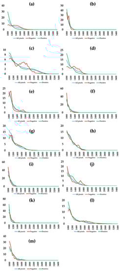 Figure 3 represents the percentage of pixels with negative or positive NDVI trends, non-trends and, finally, the total of pixels in each altitude higher than 1000 m, the mountainous zones within mainland Spain. Figure 3 shows how the curves from the negative and positive NDVI trends are different than the curve of distribution, which represents all the pixels in the mountainous systems. It shows at a glance how the 13 mountainous zones (Figure 3a–m) present differences in the trend distribution curves at different altitudes. It seems remarkable that, in general, the green line evolutions are more similar to the blue lines, than to the red lines. This implies that the greening (growth) in the vegetation patterns are near to the expected (pixels), whereas the red (decrease) in the vegetation trends are more different than expected.