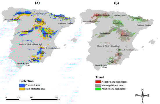 (a) Study area. The protected areas are national parks and biogeographical regions of the continental zone from mountains in Spain higher than 1000 m. (b) Pixels with NDVI trends (p-value < 0.1) during the 2001–2016 period.