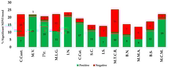 It is also interesting to note that M.V, Pir., C.Cat., I.N and M.C.M. showed a great difference between the percentage of positive and negative pixels, with a predominance of positive ones (always the percentage of positive trend pixels higher than 19). In contrast, the greatest difference between negative and positive pixels within a mountainous system occurred in C.Cant. and M.T.C.R. (see Figure 5), with more positive pixels.