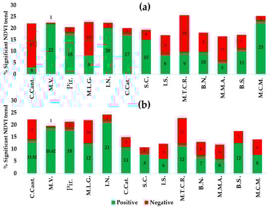 Figure 7a shows how, from these mountainous systems that showed lesser observed pixels with NDVI positive trends in addition to higher observed pixels with NDVI negative trends, C.Cant., M.L.G. and M.T.C.R. were those in which the negative trends occurred more often than expected. Conversely, M.V., Pir, I.N., M.C.M., and C.Cat. showed fewer negative NDVI trends than expected, in addition to higher positive NDVI trends than expected by the statistics performed in the present paper (see also Figure 7a). Furthermore, in the cases of the last five mountain ranges mentioned, these differences between occurred and expected were higher than 45%.