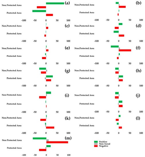 Figure 7b shows how, in protected areas, the percentage of the difference between observed and expected NDVI negative trend pixels in protected areas were higher than 20%, while, in non-protected regions the reverse was the case. Alternatively, the positive NDVI trends were very similar between the observed and expected counts.