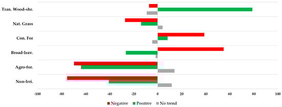 Figure 8 shows how Tran. Wood-shr. was the land cover type with the highest difference between observed and expected positive pixels (almost 80%). This difference revealed greater positive pixels than expected. Additionally, the number of negative pixels was lower than expected (difference smaller than 20%). Agro-for. and Non-Irri. were those with the highest difference between observed and expected NDVI negative trend pixels, with higher for anticipated than for observed. It also was found there were fewer positive than expected while Con. For., and the Broad-leav. were those cover types in which it was found the worst changes to the NDVI. Con. For. and the Broad-leav. showed greater negative NDVI trend pixels than expected. The NDVI evolution from 2001–2016 seems to be worse in Broad-leav. than in Con. For. because fewer positives were observed than expected while in Con. For greater positives were observed than expected (see Figure 9 for more detail).