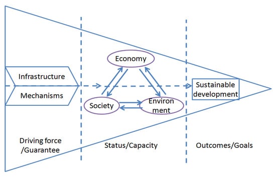 Based on the above understanding, at present, the theoretical framework of sustainable development is mainly manifested in the following models: pressure-state-response model (PSR), reaction-action cycle (RAC), Daly triangle, information pyramid, etc. [20,21,22]. Among them, the most widely used is the PSR model proposed by the UN Commission on Sustainable Development, based on which some variation models, such as Driving Force-State-Response Framework (DFSR), Pressure-State-Impact-Response Framework (PSIR), Driving Force-Pressure-Status-Impact-Response Framework (DPSIR), and so forth, are generated. The advantage of this model is that it theoretically contains a clearer logical relationship, viz., “what is the status quo, why, and how to deal with it?” Unfortunately, during the specific operation, the basis or logic of the causal relationship between many indexes is not very reliable, and even perplexed by the problem of two-way causality.
