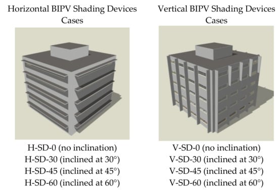 The proposed horizontal modelling cases (H-SD) and vertical ones (V-SD), where four BIPV inclination settings are examined.