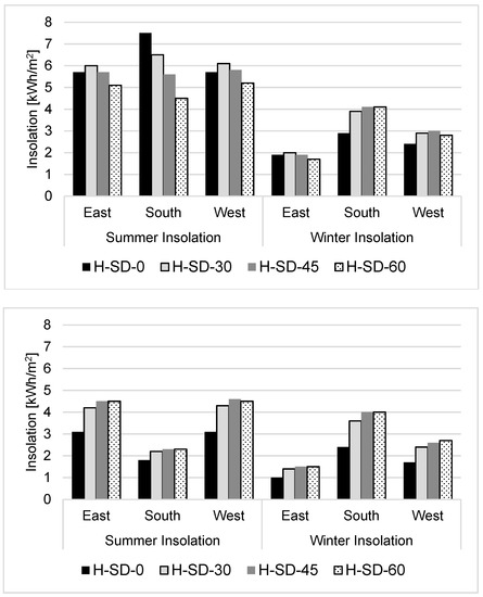 Figure 3 illustrates the normalised insolation levels recorded for the different cases of the examined horizontal BIPV shading devices. It shows insolation values for each facade at summer and winter as a total daily average considering three inclination angles. Insolation was recorded over the BIPV shading devices installed on the top and typical floors in order to examine any potential shading effect of the top shading devices on the bottom ones. As for the top BIPV shading devices, these are totally exposed to sun. The highest insolation level (7.5 kWh/m2) was recorded in summer in the case of the southern facade with no inclination (H-SD-0). This is because the sun is almost perpendicular to the PV as the solar altitude at noon in summer in Riyadh is 85.9° [33]. This is also in agreement with the average incident solar radiation data of Riyadh [34]. As the inclination angle increases, summer insolation received by PV panels installed on the southern facade incrementally decreases by about 1 kWh/m2 for each case. On the contrary, the solar altitude at noon in winter in Riyadh is 41.8° [33]. This reduces the insolation value received by the horizontal PV panels installed on the southern facade to 2.9 compared to 7.5 kWh/m2 in summer. However, increasing the PV inclination angle in winter increases the PV exposure to sun, which increases the insolation value by about 1.1 kWh/m2 at all the examined inclination angles. The eastern and western facades received a relatively high amount of insolation in summer compared to the southern facade. The highest amount was 6 kWh/m2 in both the eastern and western facades in the case of a 30° inclination angle. In winter, this value drops to 1.9 kWh/m2 in the eastern facade and 2.7 kWh/m2 in the western one. In general, changing the PV inclination angle in the eastern and western facades has less effect compared to the southern facade.