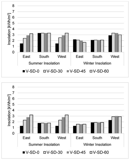 Similar to the above, Figure 5 illustrates the normalised insolation levels recorded at the different examined cases of vertical shading devices. It shows insolation values for each facade in summer and winter as a total daily average considering three examined inclination angles. Insolation was recorded over the shading devices installed at the beginning and middle of the facade in order to examine any potential shading effect between the shading devices. In general, results showed that despite the fact that vertical shading devices are not recommended on southern facades due to their limited shading potential at noon, especially in the top floors as presented in Figure 4, they could harvest a relatively good amount of insolation in summer compared to the horizontal shading devices. As for the exposed BIPV shading devices installed at the beginning of the southern facade, the normalised insolation level in case V-SD-0 in summer was 3.3 compared to 7.5 kWh/m2, which was observed in the top floor of case H-SD-0. This is about 45% of the amount received by the southern horizontal shading device. This indicates that architects can effectively use vertical louvres as BIPVs on the southern facade. However, their limited shading potential on windows, as numerically presented in Section 3.3, should be enhanced by using other shading means such as blinds. In the case of internal vertical BIPVs installed at the southern facade, the normalised insolation level in summer dropped to 1.8 kWh/m2 due to the PV self-shading effect. This shading effect occurs as a result of the shadow of the external vertical shading devices on the internal ones mainly in summer. Table 4 shows that the BIPV Sunlit Fraction value in this case is only 0.32, which means that about two-thirds of the PV is shaded. The above-mentioned normalised insolation value (i.e., 1.8 kWh/m2) is similar to the one recorded in the typical floors of case H-SD-0, which makes the semi-exposed horizontal and vertical shading devices installed on the southern facade equivalent in terms of harvesting insolation. Insolation values and Sunlit Fraction values recorded at the southern facade remained the same for all the vertical BIPV shading devices as no inclination was tested on this facade.