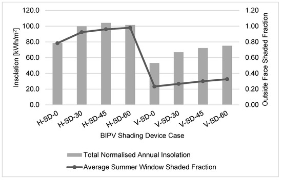 To assess the performance of the examined BIPV shading devices discussed above, the insolation value cannot solely be used as an indicator. This is because some of the examined configurations may provide a relatively high insolation value but may not provide the required window shading, which increases the energy required for cooling in summer considering the examined hot climatic conditions. Some studies [30,31] also suggested that it is also useful to consider the impact of the BIPV shading effect on natural lighting and, accordingly, the required lighting energy. However, the focus in this study is maintained over window shading as an advantage that helps reduce the cooling energy. This is because some estimations suggest that the energy required for lighting the building represents about 15% of the typical building total energy consumption in hot climates [38]. Some estimations also suggest that the ratio between the electricity demand required for lighting and cooling in office buildings located in hot climates is about 1:6. This is due to the current advancement in lighting technology including the use of energy-efficient lighting such as LED technology, in addition to lighting control. In such climates, the heating needs are insignificant [39]. Thus, the window Face Sunlit Fraction is used here to quantify the fraction of the window exterior surface that is illuminated by beam solar radiation. It could also be presented as Outside Face Shaded Fraction, which is adopted here. As for insolation, it is possible to sum up summer and winter insolation values for each inclination angle to find out the higher average annual total value. Given that the PV area is normally distributed over the three facades, the normalised insolation value could be used for comparison. Thus, the main aim is to find out the geometry of BIPV shading devices that offer the best integration of these two variables and the compromise that may be accepted here. Figure 6 shows the obtained results. It may be noted that horizontal BIPV shading devices installed on the eastern, southern, and western facades offered better performance in general compared to the vertical ones.