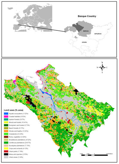 The social-ecological system of metropolitan Bilbao is located in the region of Bizkaia in the Basque Country, northern Spain (Figure 1). It is divided into 29 municipalities and covers an area of 413 km2 with a population of 893,697 inhabitants, resulting in a high population density (2164 inhabitants per km2). In this region, urban areas are situated in the valley along the estuary of the river Nervión-Ibaizabal, which is delimited by small mountains and the coast to the north. The periurban ecosystems surrounding the urban areas of metropolitan Bilbao form the BMG and occupy almost 75% of the metropolitan area. These ecosystems include beaches, cliffs, rivers, meadows, scrublands, natural forests and forests plantations. Mixed-oak forests, Cantabrian evergreen-oak forests, beech forests and riparian forests represent the potential vegetation of the study area. However, these natural forests occupy only 12.3% of the BMG, while 36.9% of the BMG is occupied by forest plantations, as a result of the reforestation performed during the 20th century. Grasslands and crops cover 27.4% of the area and mainly produce peppers, apples, local white wine (txakoli), milk, cheese and livestock (Figure 1).