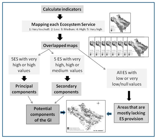 All ES maps were overlapped using the Raster Calculator of the software ArcGIS 10.3 [44] to spatially visualize the most relevant areas for the provision of multiple ES and those areas that are mostly lacking ES provision. Those areas with high or very high values (values = 4 or 5) for at least 5 ES (habitat maintenance + 4 ES) were proposed as principal components of the GI. Those areas with high, very high or medium values (values = 5–3) for at least 5 ES (habitat maintenance + 4 ES) were proposed as secondary components of the GI. In BMG the habitat maintenance is considered as a priority ES due to scarcity of natural areas and fragmentation of the territory. Finally, those areas with low or very low or null values (values = 2 or 1) for all ES were considered as areas that are mostly lacking ES provision (Figure 2). Subsequently, this map was overlapped with the map of land use types to analyze how they contributed to the different identified areas.