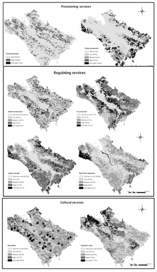 The maps indicate high spatial variation of the examined services across the BMG. In the case of provisioning services 20% of the BMG showed high or very high values for both ES. On the contrary, regulating services, air purification and carbon storage, were the ES that were best supplied by the study area (38% and 37% of the BMG, respectively, with high or very high values). However, high or very high values for habitat maintenance and water flow regulation were only found in 15% and 11% of the study area, respectively. For cultural services, namely aesthetic value and recreation, 23% and 21% of the BMG, respectively, showed high or very high values (Figure 3).