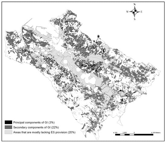 Spatial distribution of the most relevant areas for the provision of multiple ES, which will be the potential components of the Green Infrastructure (GI) (principal and secondary components of the GI), areas that are mostly lacking ES provision, and percentage of surface they occupy in BMG. Areas with high or very high values (values = 4 or 5) for at least 5 ES (habitat maintenance + 4 ES) were proposed as principal components of the GI. Areas with high, very high or medium values (values = 5–3) for at least 5 ES (habitat maintenance + 4 ES) were proposed as secondary components of the GI. Areas with low or very low or null values (values = 2 or 1) for all ES were considered as areas that are mostly lacking ES provision.