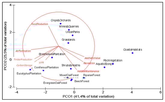 The relationships between the ES provided by the BMG and the land use types considered are shown in Figure 5, where the first two components of the PCA are presented. Factor 2 (explaining 44.4% of the variance) and Factor 1 (explaining 23.5% of the variance) represent a trade-off between food production and the rest of the ES analyzed and between ES provided mainly by forest and shrubs ecosystems and those supplied by other land use types, respectively (see Appendix: Table A6). The upper left quadrant represents food production; the lower left quadrant represents ES provided mainly by forest and shrubs ecosystems (timber production and regulation services except for habitat maintenance); and the lower right quadrant represents those ES supplied by natural ecosystems (cultural services and habitat maintenance). Therefore, land use types subjected to greater human influence, such as forest plantations, mines and quarries, orchards and crops, grasslands and urban parks were located from the diagonal upwards, whereas natural ecosystems (coastal habitats, rocky vegetation, aquatic ecosystems, and natural forests) were located from the diagonal downwards. Therefore, if managers want to prioritize, for example, food production ES in some areas, they have to be aware that regulating and cultural ES provision will be reduced. On the other hand, if they prioritize land use types as natural forest or shrubs, multiple ES provision will increase.