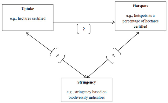 Moreover, we are interested to know whether ranking high in terms of stringency, total standard-compliant areas, and proximity to biodiversity hotspots are in any way related. A positive relationship between these three variables would mean that there are VSS organizations with exceptional relevance for biodiversity policy for which we need to closely examine their ties to other organizations. We are therefore interested to learn if higher scores in one ranking leads to higher or lower scores in another (see Figure 1). Are more stringent VSS biodiversity criteria conducive to uptake leading to a higher level of standard compliant hectares for a given VSS organization? Does more standard compliant area translate into greater coverage near or within hotspots? Additionally, do more stringent VSS criteria imply that VSS organizations operate close to or within hotspots?