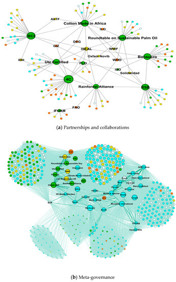 In contemporary VSS policymaking, understanding interactions among organizations descriptively may help us assess the potential for VSS organization’s collaboration with other relevant governance actors to address complex sustainability challenges [5]. This is also in line with an evolving research agenda looking at the interactions between VSS organizations and (inter-)governmental policymakers. Interactions studied include partnering among public actors and VSS organization’s representatives [28], delegation of or orchestration of (inter-)governmental rules towards VSS [6,9], meta-governance of VSS by governments and international organizations [29], and lobbying by VSS organization representatives towards governmental organizations and vice versa [8].
