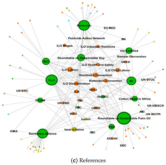 The study first draws from datasets from Fransen et al. [5], which focused on VSS organizations governing global agro-commodity chains, such as coffee, tea, cocoa, sugar, palm oil, cotton, soy, and flowers. Information from these datasets is then complemented by data on these commodities from the International Institute for Sustainable Development Sustainability Standards Initiative report on standards and biodiversity [1], the International Trade Centre’s Standards Map data, and the recent groundbreaking study by Tayleur et al. [11] on the location of agriculture-focused VSS organization standard-compliant areas. As is the convention in academic and grey literature on VSS [1,5,11], we focus on multiple crops, given how many VSS organizations themselves focus on various crops and are therefore expected to affect policy-making on various crops. Combining these four data sources allows us to analyze 11 relevant VSS focused on agro-commodities. To our knowledge, this is the first time that large-N network, geographic data, and VSS organization performance data are combined in this way to make sense of VSS organizations’ collaborative potential and potential to cross-fertilize with (inter-)governmental organizations and other actors on an issue area, such as biodiversity.