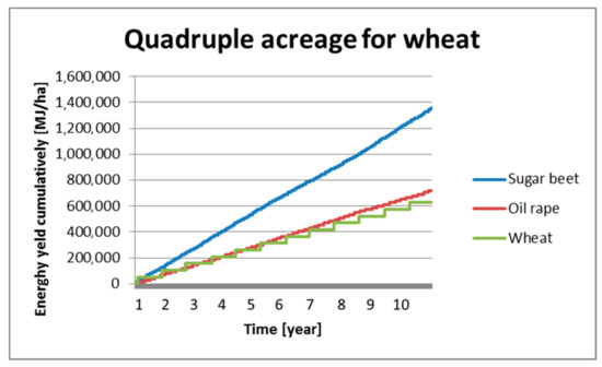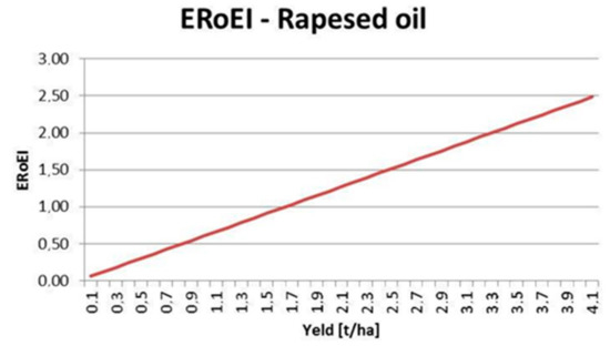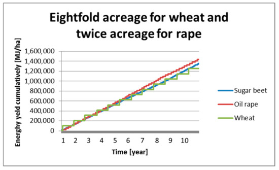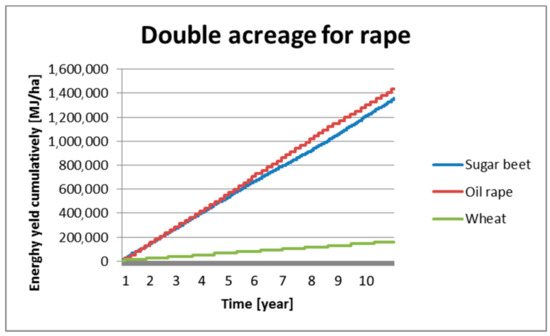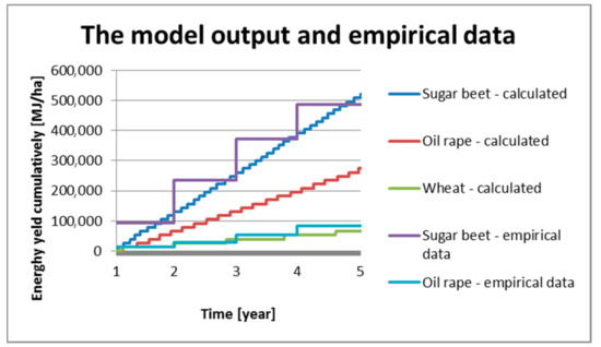 51]. The values we consider reach 22,080.5–114,818.6 MJ/ha per year. However, this study estimates yields of about 2 tons per hectare. Our empirically-determined values are about 3.5 t. This significantly improves the overall result. As the graph in