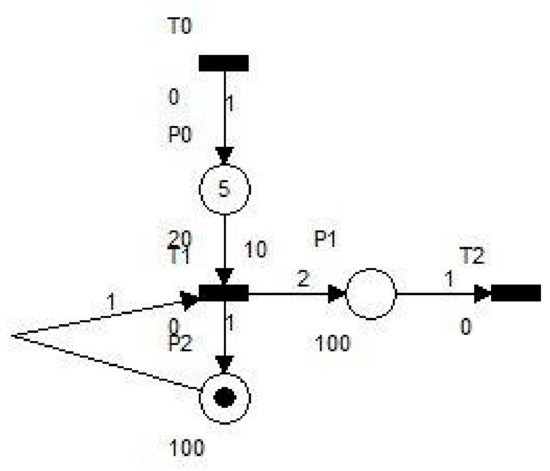 The model processed with the stochastic Petri net does not allow to work with a decimal expression of the total number of passing tokens. However, the input values are in decimals, and the entered value is multiplied by ×1000 (formula (3)), which allows the entering of the values accurately, without the need for rounding.
