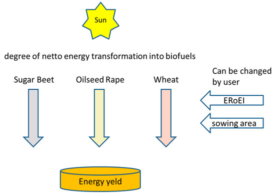 Figure 1 by the backward arrow. To create balance, it is assumed that the output of the process also involves process energy. This approach is necessary because it simultaneously takes into account the sustainability of the process itself, which is, for considering biofuels as a resource used in larger quantities, essential. The arrow labelled with a question mark represents a problem to be solved—that is, what proportion of the other inputs occupies a total net power output process. As the diagram on