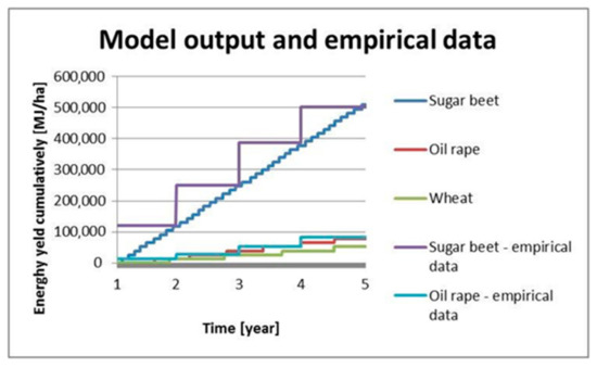 Figure 7 showed sufficient precision of modelling results. Due to the analysis based on the models, it is possible to examine different combinations of renewable resource use or predict their expected future development. Here, however, when using modelling results, it is necessary to take into account possible short-term fluctuations caused by local weather effects that these models do not consider. The actual value may differ considerably from the predictions in individual years. Given that a dynamic modelling tool has been used for modelling, the results can be modelled for longer periods of time, which improves modelling results—the average earnings over a longer period will match better to the predicted values, while the results of a particular year may differ considerably from the predicted value due to seasonal effects. However, this situation did not occur during the monitored period, and the values predicted by the model corresponded to the empirical data for individual years. Various changes in the structure of crops and growing technology were analyzed using the model, and changes in achieved results were also monitored. The modelling results confirmed and complemented the conclusions drawn on the basis of the calculations. Because, for practical energy use, the simplest and most effective way of obtaining fuel is desirable, the most efficient from the analyzed crops is sugar beet, and consequently produced bioethanol. Changes in model settings have also allowed some further analyses to formulate general recommendations for decisions about the structure and type of energy-crop mix. In addition to the results on net energy yields per hectare, the models can also answer the question on how large a cropping area should be used to achieve the desired amount of energy from a particular energy source or from a relevant combination of these resources or crop technologies.