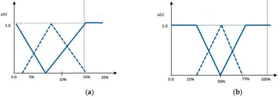 Membership functions to (a) share of the cost element in the cost of the object and (b) the expected changes in the quantity of work and the expected changes of the unit price.