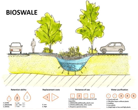 - Lejcuś, K.; Burszta-Adamiak, E.; Dąbrowska, J.; Wróblewska, K.; Orzeszyna, H.; Śpitalniak, M.; Misiewicz, J. Katalog Dobrych Praktyk—Zasady Zrównoważonego Gospodarowania Wodami Opadowymi Pochodzącymi z Nawierzchni Pasów Drogowych [Good Practice Catalogue—The Rules for Sustainable Management of Stormwater from Road Surface]; Municipality of Wroclaw: Wrocław, Poland, 2017. [Google Scholar]