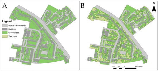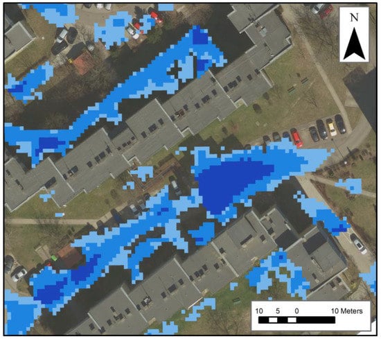 - Tree coverage and elevation—verification sample: Airborne laser scanning Light Detection and Ranging (LiDAR) for urban areas. Using LiDAR, it is possible to achieve a 0.5 m × 0.5 m resolution; however, in this research, a 1.0 m × 1.0 m grid was constructed.