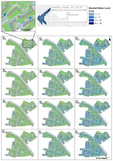 | Scenario | Area in Water Level Classes [m²] | Volume [dm³] | Max Water Height | |||