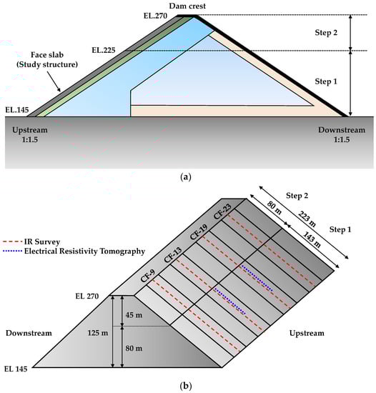 Figure 1b shows a schematic of the IR and ERT survey lines of the study object, namely, CF-9, -13, -19, and -23 of a concrete face slab, with a width of 15 m upstream, all of which are located at the center. The IR survey was carried out in steps 1 and 2, and the ERT survey was carried out at CF-13 and -19 in step 2. Both surveys were conducted from top to bottom. Through the IR survey, 21 stations were acquired for a length of 79 m in step 2, and 23 stations were acquired for a length of 80 m in step 1. The spacing of the stations was set to 2.5 m for the cavity estimation examined through a GPR survey [
