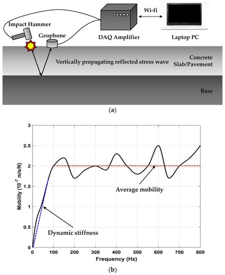 (a) Schematic of the impulse response tester. This equipment consisted of an impact hammer, a data acquisition device (DAQ) amplifier, a geophone, and a laptop PC. (b) The mobility plot of a typical concrete face slab. The dynamic stiffness was defined as the reciprocal of the slope at a frequency of less than 80 Hz. The average mobility was defined as the arithmetic mean of the mobility within the 100–800 Hz frequency range.