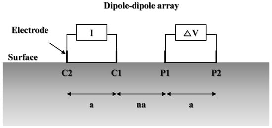 A dipole-dipole array of a typical electrical resistivity tomography (ERT) survey. The resistivity of the study object was calculated by measuring the potential difference between two current and two potential electrodes.