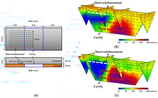 (a) A schematic of the concrete model used to apply the electrical resistivity tomography (ERT) survey using non-destructive electrodes. This model was designed to investigate the effects of the steel reinforcements and cavities in the interior and bottom of the concrete. (b) ERT survey results using non-destructive electrodes, and (c) ERT results using forward modeling. In both models, the steel reinforcements showed low resistivity effects, and the cavities showed high resistivity effects.