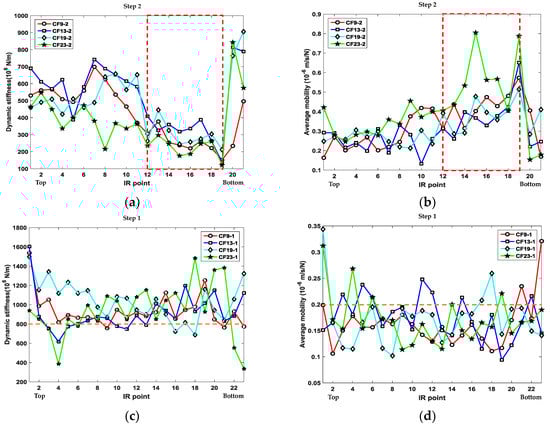 Figure 5a,b show the dynamic stiffness and average mobility at CF-9, -13, -19, and -23 of the concrete face slab. This plot shows an inverse relationship between the general dynamic stiffness and average mobility. The overall dynamic stiffness decreased from top to bottom (IR points 1–19), and then tended to increase sharply at the bottom (IR points 20 and 21). In particular, at IR points 12–19, the entire concrete face slab showed a relatively low dynamic stiffness and high average mobility (red dotted box). In addition, throughout the concrete face slab shown in this box, CF-23 was expected to be the most vulnerable. The overall upstream slope of step 2 indicated that the state between the concrete face slab and the underlying support layer was more unstable at the bottom than at the top, and that a cavity was likely to exist at the bottom. IR points 20 and 21 exhibited a sharp high dynamic stiffness and low average mobility, which was presumed to maintain the high quality of the concrete because the supporting soil in the red dotted box was lost, accumulated at the bottom, or no space existed where the supporting soil would be lost near the bottom.