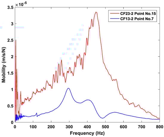 Mobility-frequency graph according to the conditions of the concrete. Impulse response (IR) point 15 of CF-23 had the highest average mobility and a low dynamic stiffness. IR point 7 of CF-13 was relatively high in dynamic stiffness and low in average mobility.