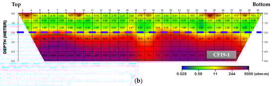 Figure 7a). In addition, it was confirmed through GPR that the high resistivity zone coincided with the cavity estimation zone. However, CF-19 without a cavity estimation zone exhibited a homogeneously low resistivity effect horizontally up to about a 2 m depth (